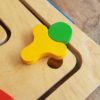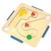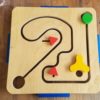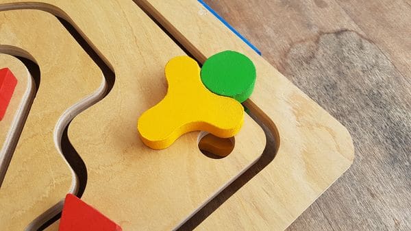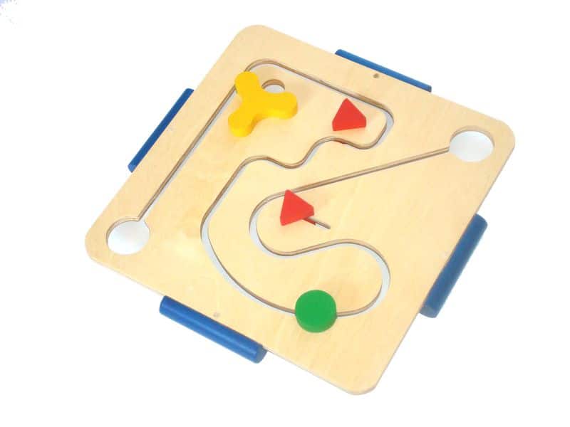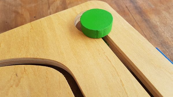 Juguete orientado a desarrollar la motricidad fina del niño. Se desplaza la ficha verde por la ranura y se la lleva de un extremo al otro del recorrido sorteando los obstáculos móviles, tiene dos formas de juego: Una es apoyado en una mesa y mover la ficha con la mano, la otra es agarrar el juego y mover la placa para que la ficha se mueva por la acción de la gravedad.
